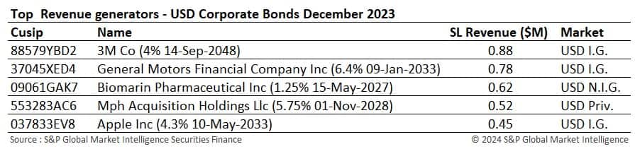 The highest revenue generating bonds of 2023 are reflective of the top 5 USD corporate bonds that have been seen in the monthly tables through much of the year. 3M Co (4% 14-Sep-2048), the top earning bond, generated annual returns of $12.16M followed by Microchip Technology Inc (0.125% 15-Nov-2024) which produced $9.7M in revenues for lenders.