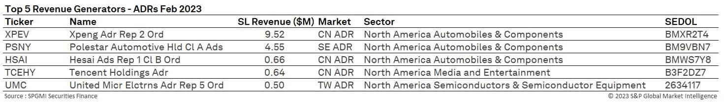 Xpeng (XPEV) continued to drive revenues across this asset class. Fees in this stock have declined over February despite active utilization remaining above 95%. A similar situation took place across Polestar Automotive (PSNY). Benchmark fees declined but active utilization remained relatively high (+65%). The automotive sector remains well represented across the ADR space, accounting for the top three highest revenue generators. Tencent holdings generated $640K during the month. This stock has once again been affected by the selloff in tech stocks over the month and remains challenged by financial difficulties.