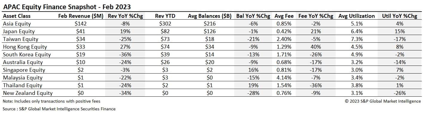 Revenues across APAC equities declined 8% YoY (12% MoM) to $142M. Revenues decreased across all markets except Japan and Hong Kong. Balances and fees also declined YoY but utilization increased by 4% reaching a six-month high at 5.1%. Despite revenues falling when compared with January and February 2022, they're still significantly higher than those seen during February 2021 ($123.7M) and February 2020 ($134.6M).