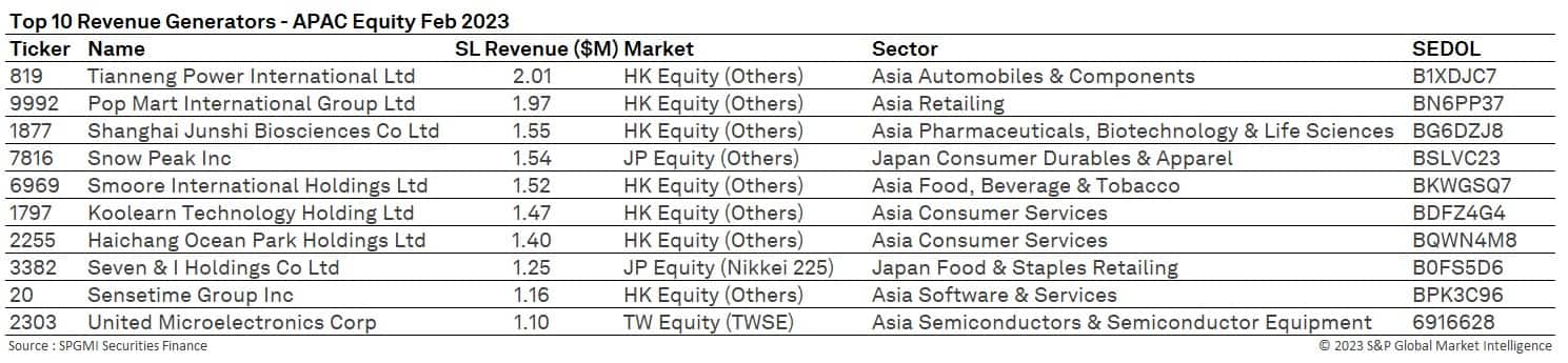 Seven and I Holdings Co Ltd (3382), a Japanese food retailer, entered the top ten during the month as demand increased towards the end of the month as its record date approached. Sensetime Group Inc (20 HK), which has been a popular borrow for some time, also joined the top ten. The company has been affected by legislation that bans US entities from exporting goods to Chinese technology companies. This has had an impact upon its share price and has led investors to believe that the company may come under financial pressure in the future.