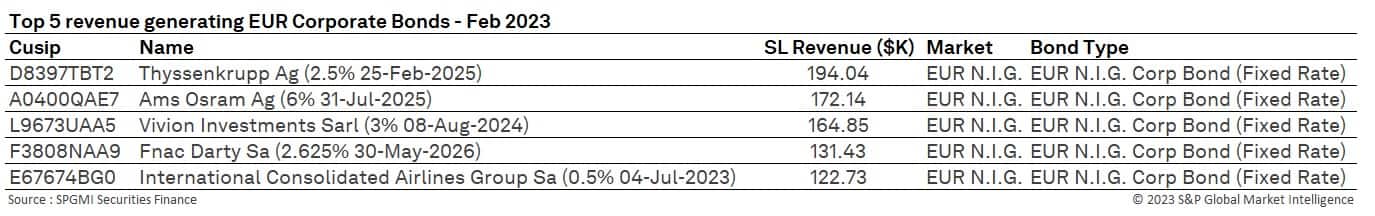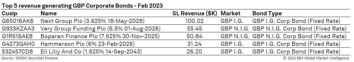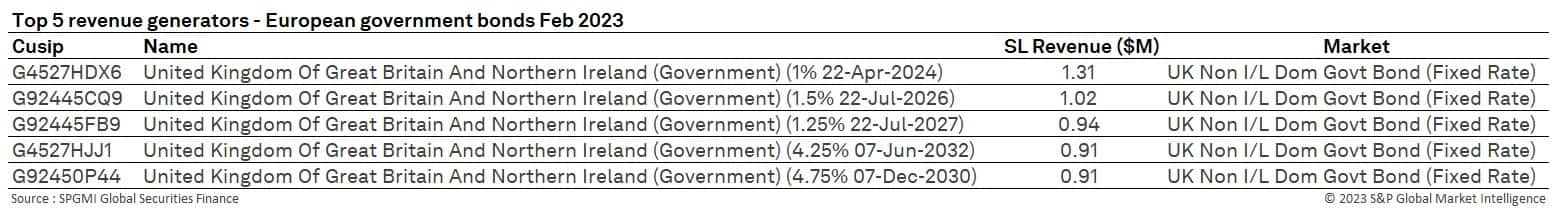 The highest revenue generating government bonds continue to be the very short-dated issues. This is the same across the US and Europe. European government bonds are all UK denominated. Investor short interest has grown across UK Gilts in recent weeks given the rapid increase in interest rates and the stubbornly high levels of inflation. The UK holds a higher proportion of its debt in inflation linked bonds which means that the UK's interest payments are likely to surpass those of countries that have larger debt issuance levels such as France and Italy over the coming years.