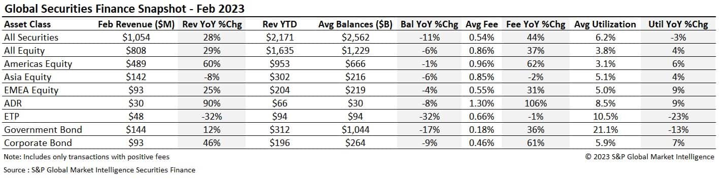 Securities finance activity remained robust throughout the month of February. Strong revenues driven by fixed income assets and US equities ensured that revenues significantly increased YoY. The continued volatility within the financial markets driven by the uncertainty surrounding terminal interest rate levels and the slowdown in inflation continue to provide significant borrowing opportunities for market participants. Whilst inflation remains stubborn and relatively high across major world economies and the uncertainty regarding soft, hard or no landing scenarios remains, the investment landscape is expected to remain challenging. The first quarter of 2023 is likely to be very strong for the securities lending market, although, as was the case in 2022, not all market participants are likely to reap the benefits on offer to the same degree given the specific pockets of demand and revenues that are on offer.