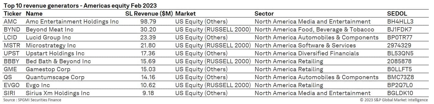 Similarly, Evgo Inc (EV), which owns and operates fast charging networks across the USA, also entered the table during February, generating just over $10M. Redundancies across the company to optimize its cost structure reportedly led to a decline in its share price over the month. The company (at the time of writing) has just over 11% of its outstanding shares on loan. Other EV related stocks such as Lucid Group (LCID), and Sirius XM Holdings Inc (SIRI) generated slightly lower revenues than January.