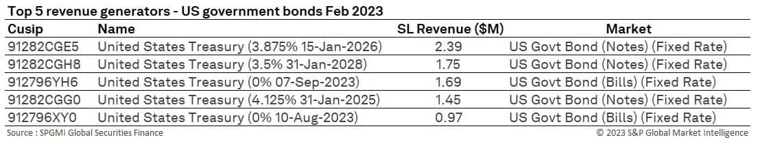 Over the month, revenues generated by government bonds increased 12% YoY but decreased 15% MoM. Average fees remained steady at 18bps which is 3bps higher than the 2022 average. Average utilization decreased both over the year and the month. Revenues for the first two months of 2023 are currently 14% higher than during the first two months of 2022. Utilization (21.1%) is at its lowest however since 2020.