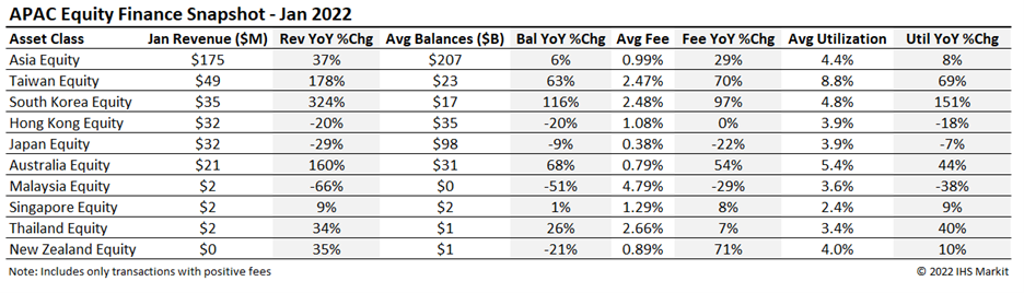 APAC Equity Finance revenues totaled $175m in January, a 37% YoY increase but a step down of 13% MoM. The region continues to boast the highest average fees globally at 0.99%, a 29% increase YoY and balances remained steady at $207b. Taiwan and South Korea both continue to lead the region in revenue, producing $49m (+178% YoY) and $35m (+324% YoY) respectively. Australia produced $21m in January, a 160% YoY increase and 47% MoM increase.