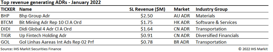 Revenues from lending American Depository Receipts (ADRs) saw a steep drop of 58% YoY and 54% MoM, totaling $21m in January, marking it as the lowest monthly revenue since October 2020. ADR securities finance revenues were led by BHP Group ADR (BHP) and Bit Mining Ltd (BTCM), a Chinese bitcoin mining firm. BHP contributed 12% of the ADR finance revenues with $2.5m for the month of January off the delisting of the company from the London Stock exchange. Loan balances for ADR's decreased by 25% YoY, combined with narrower fee spreads (a 43% YoY fall), contributed to the downswing in January revenue.