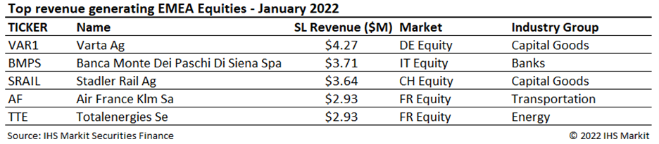 Varta (VAR1) remains at the top of the list, generating $4.27m in January. BMPS continues to bolster equity finance revenues with $3.71m and 40% of the total for Italy.