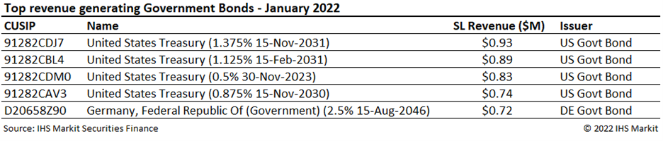 Fee-spread revenues of global sovereign debt totaled $150m for January, a 12% YoY and a 1% MoM decline. Government bond borrow demand remains robust with $1.32T in positive-fee global balances for January reflecting an 18% YoY increase. US government bond lending revenue came in at $77.8m for January, a 2% YoY and 6% MoM drop and the lowest total since November 2021. The Nov 2031 UST 10Y note (91282CDJ7) took the top rank on the revenue table from the Nov 2023 UST 2Y (91282CDM0), followed closely by the Feb 2031 UST 10Y (91282CBL4). Lending European sovereign debt yielded a return of $52.6m for January, a 22% YoY and 7% MoM increase.