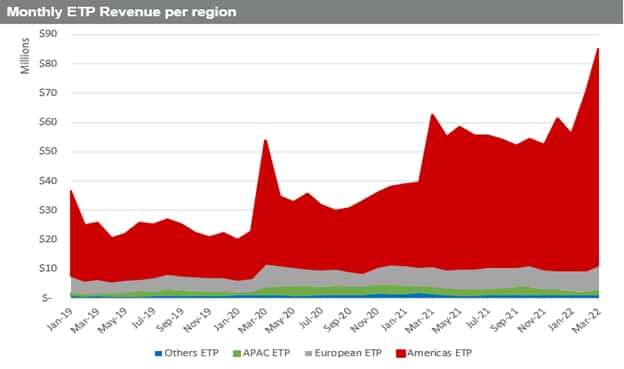 Americas ETPs dominated this month's ranking for the top 5 revenue generating names. iShares iBoxx $ High Yield Corporate Bond Fund (HYG) continued to lead the list, returning $12.78m in March. The second top revenue generating ETP was Invesco Senior Loan Etf (BKLN), with $4.27m, up by 273% MoM.