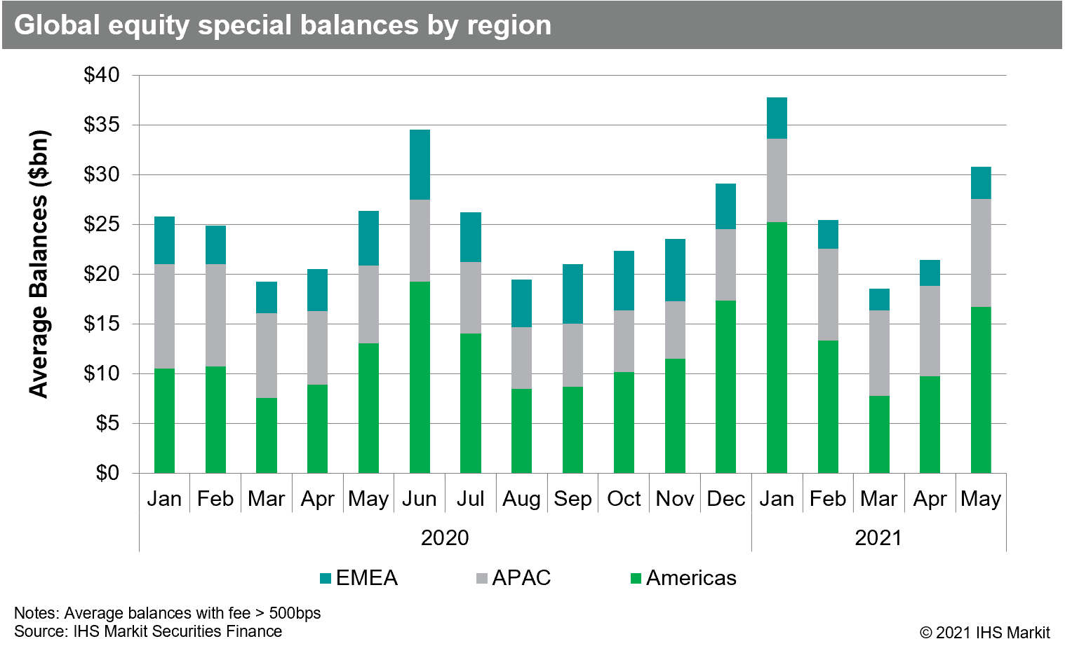 APAC equity finance revenues increased by 19% YoY in May, with returns holding steady compared with April. Asia equity special balances continue to have an upward trajectory from the 2020 low point in early November, May's $10.8bn in daily average special balances reflects a 20% MoM increase and the largest monthly average since November 2019.