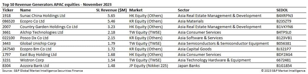 Real estate companies Sunac China Holdings ltd (1981) and Country Garden Holdings Co Ltd (2007) continued to dominate the top ten revenue generator table over the month. Korean Ecopro Co Ltd (086520) also remained a top borrow despite the recent short selling ban across the country. Both the quantity of shares on loan and the average fee have declined by circa 50% since the announcement of the ban.