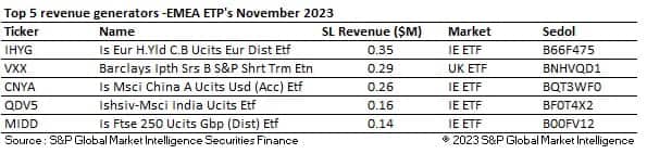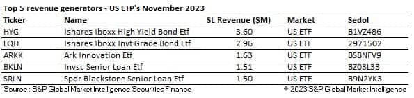 Across the highest revenue generator tables, fixed income ETFs continued to dominate across the US and EMEA. ARKK - Ark Innovation ETF generated $1.63M over the month after recording one of its best performing months ever (+31%). Investor hopes that the US will be able to start cutting interest rates in 2024 helped to propel the fund higher as gains in risk assets took off during the month. Across the APAC region, as in EMEA, ETFs providing exposure to China and the CSI300 remained popular borrows. Despite a trend of disinvestment from China being well documented over the year, the financial press is reporting record inflows by Chinese investors into exchange traded funds throughout this year.