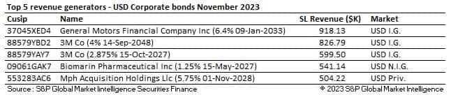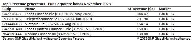 In the securities lending markets corporate bonds generated $79.4M, their lowest monthly revenue figure since March 2022. Average fees fell throughout the month ending November at 35bps but averaging 36bps over the period. This is 7bps lower than the YTD average of 43bps. Balances increased by 3% MoM and by 6% YoY as utilization hit 5.68%, its highest level since June.