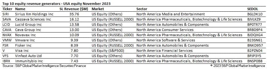 During the month the top ten revenue generating stocks in the Americas earned a combined $129.26M increasing to 39% of the total revenues of the region ($82.8M, 29% of total revenues during October). Sirius XM Holdings Inc (SIRI) continued to top the table, increasing monthly revenues by 60% when compared with October. As reported last month, a potential arbitrage opportunity continues to drive demand in this stock. Utilization remained steady over the month, but average fees increased after the dividend payment on November 7th.