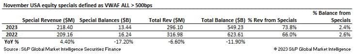 Specials activity continued to grow across USA equities during the month. Specials revenues increased to $218.4M marking a 4.4% increase on November 2022. 74% of all USA equity revenues were derived from specials over the month, representing just 2.4% of balances. YTD specials revenues of $3.356B have been generated from USA equities.