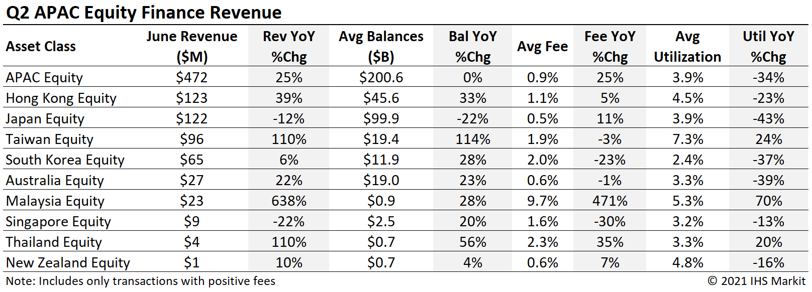 APAC equity revenues of $472m reflect a 25% YoY increase, with each month of Q2 seeing a YoY revenue increase of at least 19%. The upswing was driven by the resumption of short selling in South Korea along with increasing borrow demand in Taiwan and Hong Kong SAR. The revenue growth in the region is partly the result of a light YoY comparison with short sale bans and lower balances coming in the wake of the COVID crash; revenues for Q2 fell 1.4% short of the Q2 2019 return. Hong Kong SAR's equity finance revenues exceeded those of Japan as the most quarterly revenue generating equity market in the region for the first time since Q4 2015.