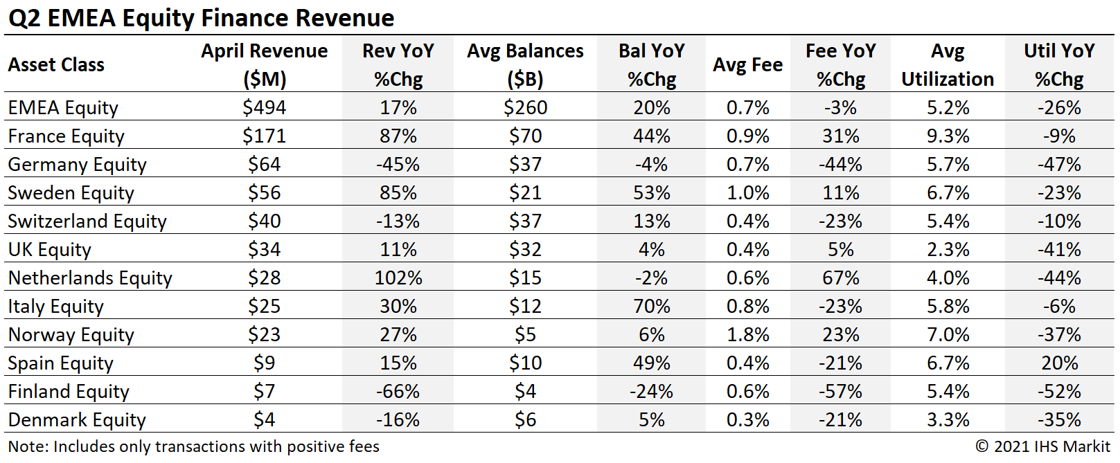EMEA equity finance revenues of $494m reflect a 17% YoY increase, with June the only month of Q2 to see a YoY revenue decline. The YoY increase was driven by the reinstatement of dividends which had been suspended or reduced in 2020. Q2 revenues declined by 30% compared with Q2 2019. The French equity market delivered the most revenue among EMEA markets in Q2, overtaking the German market which led Q1.