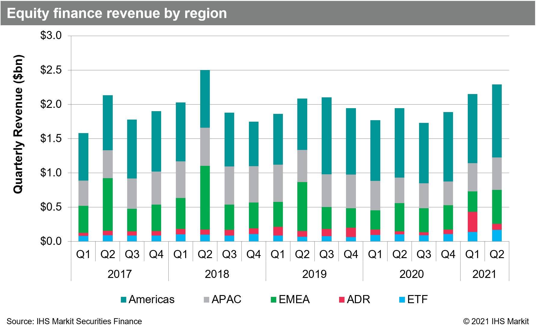 Global equities delivered $2.3b in Q2 revenue, a 16% YoY increase. The 2nd quarter built from a slow start in April, the least revenue generating month YTD, before a strong rebound in returns in May and June. Q2 was the third quarter to see consecutive QoQ revenue growth, starting from the 2020 low-point in revenues observed in Q3. In 2020 a summer slow-down in markets activity, particularly in August, caused equity finance revenues to drop off sharply. Whether 2021 repeats the summer slowdown of 2020 remains to be seen, however some of the Q2 revenue drivers are likely to persist in Q3.