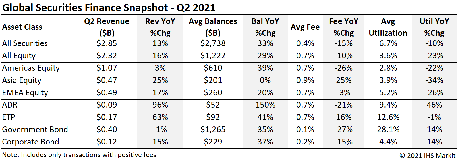 Global financing revenues for Q2 were in the middle of the range observed over the preceding five years. Global fixed income fee-based returns were the highest since 2018, however the comparison with 2020, excluding the impact of cash reinvestment returns from the 2020 rate cuts. Equity finance revenue had the most revenue generating Q2 since 2018. The upswing in equity revenues was driven by the upswing in APAC specials, div reinstatement in EMEA and IPO/SPAC related demand in US. Taken together, the drivers for equity borrow demand that were anticipated coming into 2021 are largely playing out and delivering returns. Heading into the second half of the year, APAC specials, ETP demand and US SPACs/IPOs appear likely to continue boosting returns. For fixed income the big pictures is greater loan balances and narrower spreads; revenue from rates related trades may decline, though there is a potential for credit risk to drive borrow demand for corporates, which could result in hard to borrow credits becoming a H2 return driver. H1 revenues of $5.5b reflect a 14.3% YoY increase in fee-based revenues.