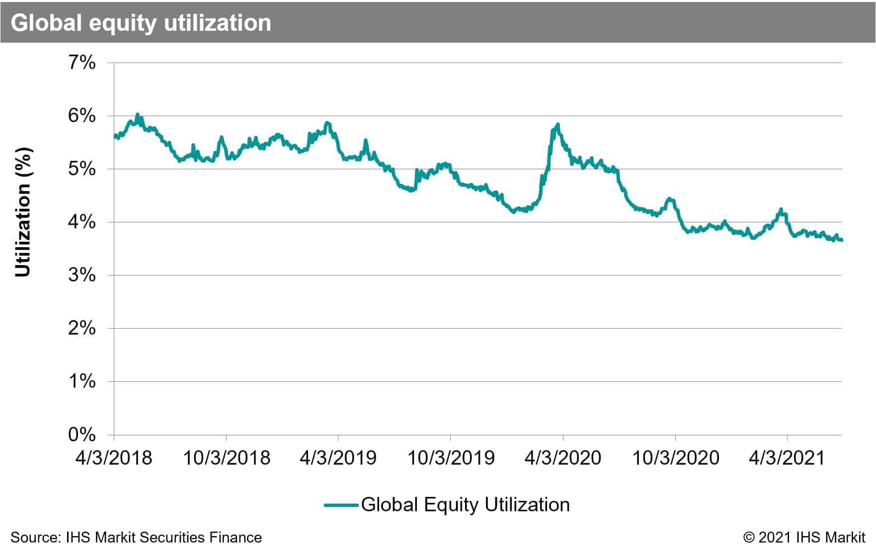 Equity on-loan balances with positive spreads averaged $1.2t in Q2, a 29% YoY increase, largely the result of recovering equity market valuation over the last year. Despite loan balance growth, global equity utilization has resumed a multi-year downtrend, which took a brief pause amid the COVID related sell-off in 2020. The Q2 average global equity utilization of 3.6% is the lowest for any quarter on record.