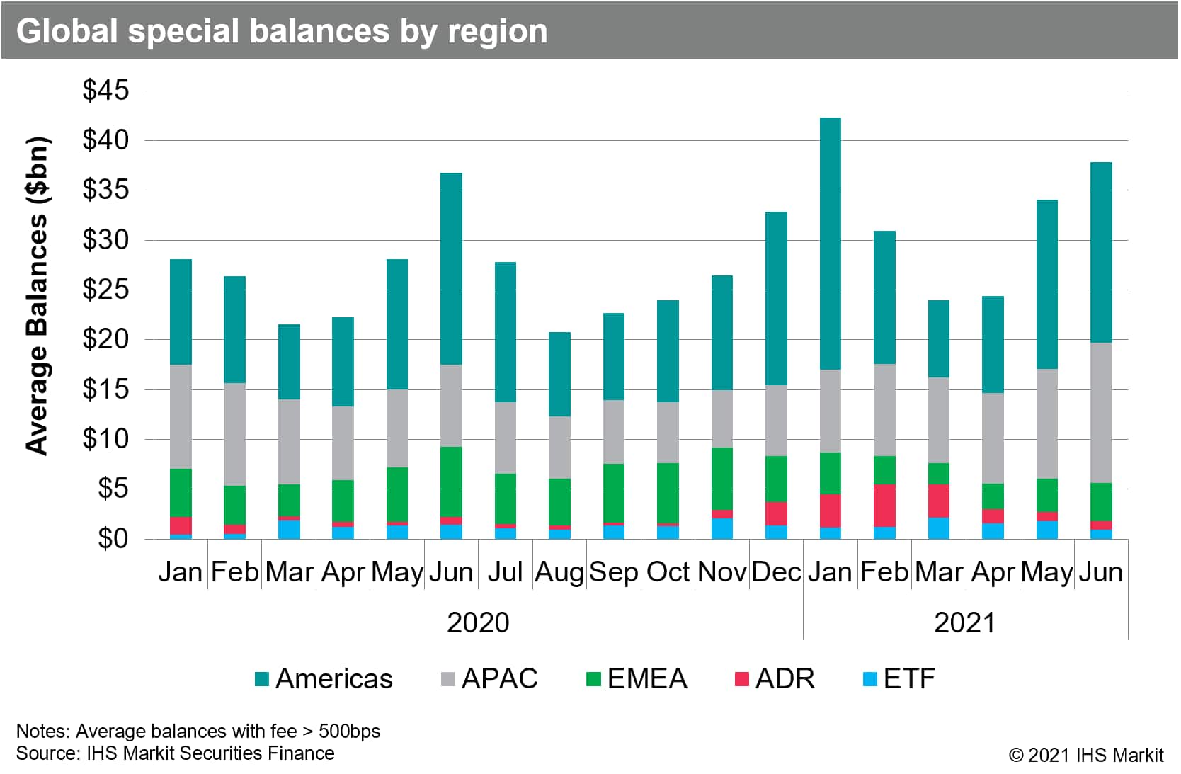Global equity special balances rebounded in Q2, following the YTD low-point observed in March. APAC equity special balances had the most notable uptick in Q2, owing to reinstatement of short selling in South Korea and a general uptrend in demand for hard to borrow shares in Hong Kong SAR, Taiwan and Malaysia. Average APAC equity special balances averaged $11.4bn in Q2, compared with $8.7b in Q1 and $7.8b in Q2 2020. Americas equity special balances declined by 3% as compared with Q1, but the shortfall was entirely the result of the January short squeeze in hard to borrow shares. EMEA equity special balances declined by 42% YoY, with the shortfall primarily the result of German equity special balances being consistently high in 2020. Specials balances for ADRs surged in late-2020 and early-2021 on the back of outsized borrow demand for Futu Holdings; ADR special balances declined in Q2 following the wrap-up of the Futu trade, though overall borrow demand for depository receipts remains strong.