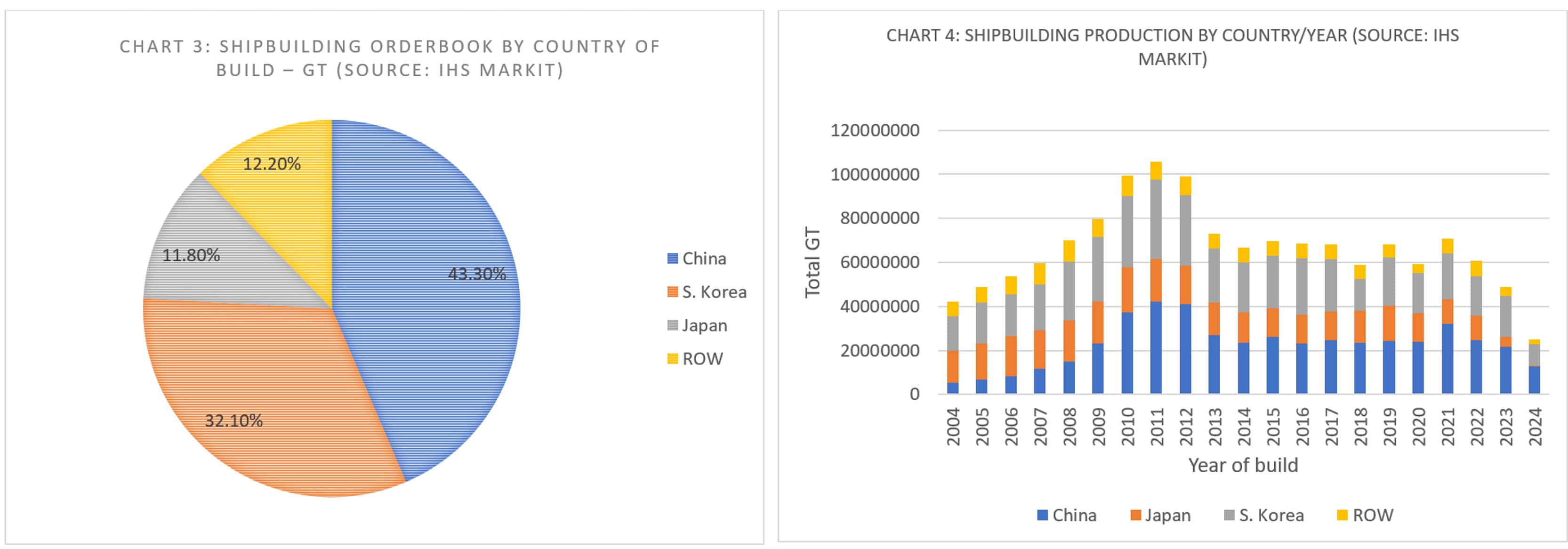 With these latest orders, China's position as the leading shipbuilding nation in terms of production output is cemented. China currently has a 43.3% share of the global orderbook (see chart 3) having held the number one spot continuously since 2017. In 2020, China produced 41% of the World's ships by GT with this figure expected to rise to 45% for 2021 (see Chart 4).