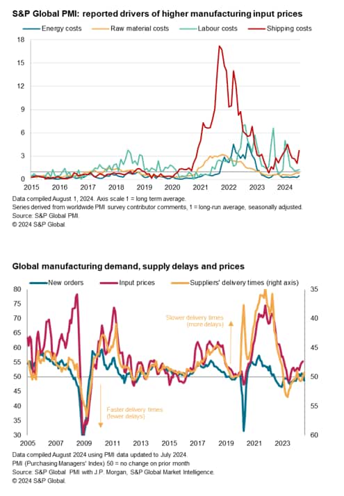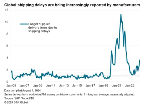 The impact of these shipping delays has varied so far during 2024, but has picked up markedly in July, and is now running in at nearly four times the long run average. While this is still well below the peak impact seen during the pandemic, it represents an impact on supplier delivery times of the likes not seen by the PMI surveys in the 15 years of data available prior to the pandemic.