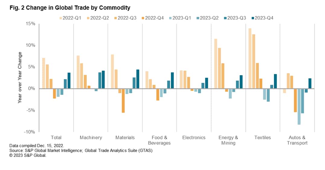 Boom time demand and supply chain inflation will both reverse in 2023, dragging on the volume and value of global trade. S&P Global Market Intelligence's global trade forecasts, shown in Figure 1, find that a downturn in the automotive and consumer goods trade will be offset by machinery and electrical goods.