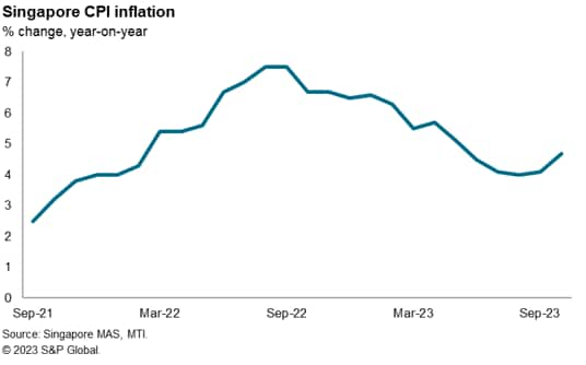 Singapore's headline CPI inflation rate rose to 4.7% y/y in October compared to 4.1% y/y in September, reflecting rising costs of private transportation due to higher car prices as well as increasing electricity and gas costs. The Monetary Authority of Singapore (MAS) Core Inflation measure rose to 3.3% y/y in October from 3.0% y/y in September.