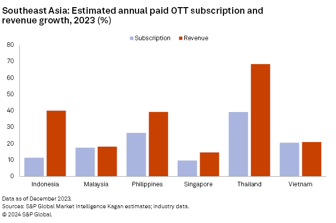 ➤ S&P Global Market Intelligence Kagan projects that combined subscriptions for paid over-the-top video streaming services in Indonesia, Malaysia, the Philippines, Singapore, Thailand and Vietnam could eclipse the 50 million mark, potentially translating to a market value of about $1.90 billion at the end of 2024.