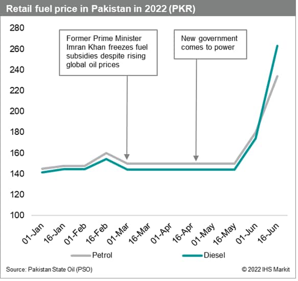 Pakistan, the fragile external position, exacerbated by soaring global commodity prices, has already led to a rapid depletion of foreign exchange reserves, sharply rising inflation, and a sudden change of government in April 2022 with a strong possibility of snap elections in the next year. Recent deregulation of domestic fuel and electricity prices as part of IMF bailout conditions further elevate the risk of social and labour unrest in the next year.