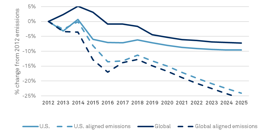 The findings showed that U.S. companies are on a trajectory to fall short of the required reductions, achieving only a 10% decrease from a 2012 baseline by 2025 ; 60% short of the 24% reduction needed to align with the Paris Agreement goal of 2 degrees warming by 2025. Large global companies are on track to exceed a 3 degree warming pathway, achieving only a 7% reduction in carbon emissions from a 2012 baseline by 2025, 72% short of the 26% reduction needed to achieve the Paris Agreement goal of 2 degrees warming by 2025.