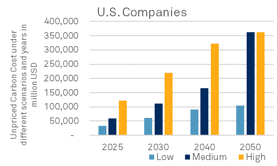 Under the High pricing scenario, the 500 largest U.S. companies face US$122 billion in UCC in 2025, equating to 11% of earnings. For the 1,200 largest global companies, that figure is approximately $284 billion, representing 13% of earnings. By 2050, the UCCs balloon to $363 billion and $898 billion for U.S. and global companies, respectively, under both the Moderate and High pricing scenario.