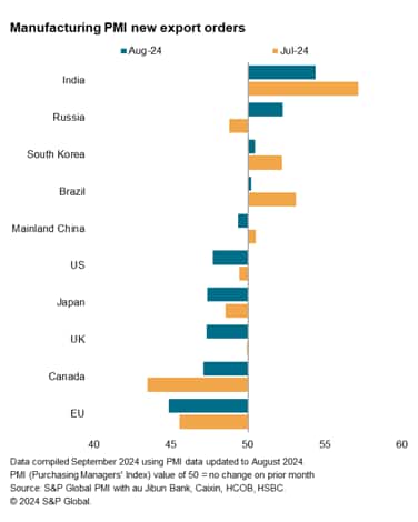 On the other hand, the EU and Canada remained the worst performers among the top 10 trading economies, with the rates of export decline being especially sharp for the EU. The US, UK and Japan meanwhile recorded more pronounced, though still modest rates of reduction in goods export orders in August.