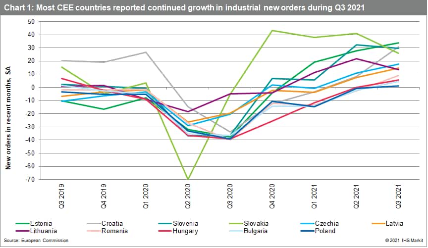 Amid strong foreign demand, European Commission surveys indicate that new industrial orders continued to rise in most Central European countries during the third quarter, remaining at historically high levels in much of the region (see Chart 1). Nevertheless, a recovery of new industrial orders does not automatically translate to a strong rebound in manufacturing production. Indeed, production is likely to be limited over the short term owing to rising supply-side constraints.