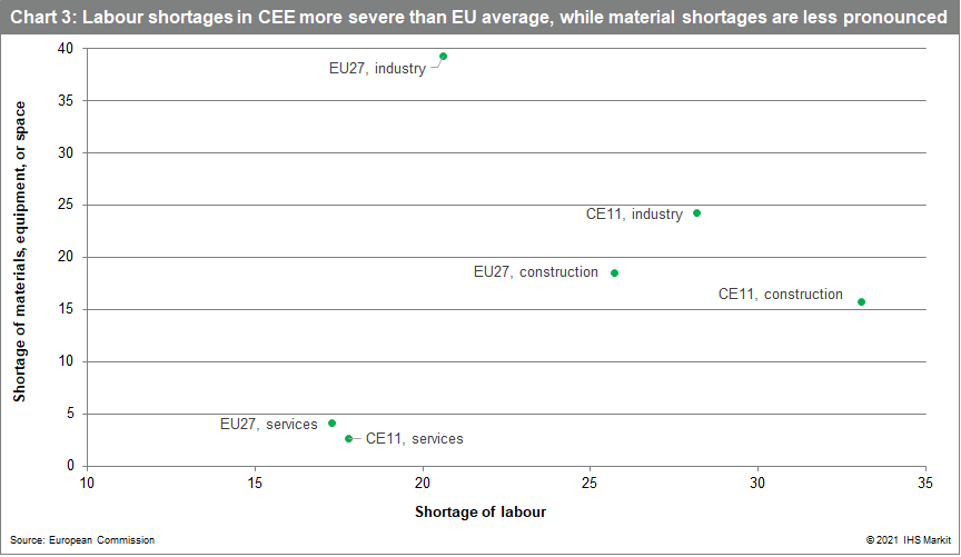 When comparing the average for the 11 EU member states from Central Europe (CE11) versus the European Union as a whole, there are some noticeable differences. Material and equipment shortages tend to be less pronounced in Central Europe, while labour shortages present a bigger problem than in the rest of the EU (see Chart 3). This pattern is similar in the services and construction sectors, and labour shortages are especially pronounced in the latter, putting at risk the planned investments associated with the Recovery and Resilience Facility (RRF). In countries with staff shortages, companies can take steps to try to ease the problem by raising labour productivity through automation and digitalisation, attracting skilled workers from abroad, and/or investing in training and education for younger employees.