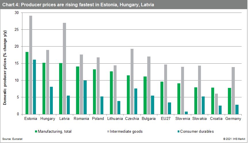 The logistics crunch has contributed to a surge in industrial producer prices across Central Europe, further affected by labour shortages (which are driving up salaries), rising energy costs (impacted by surging natural gas prices), high industrial capacity utilisation levels, and an overstressed transportation system. Manufacturing price pressures have been boosted mainly by intermediate goods, although the prices of consumer durables have also experienced rapid growth in some countries (see Chart 4). By sector, the rise in manufacturing prices has been driven mainly by high price increases for wood and wood products, petroleum, chemicals, rubber and plastics, basic metals, and electrical equipment.