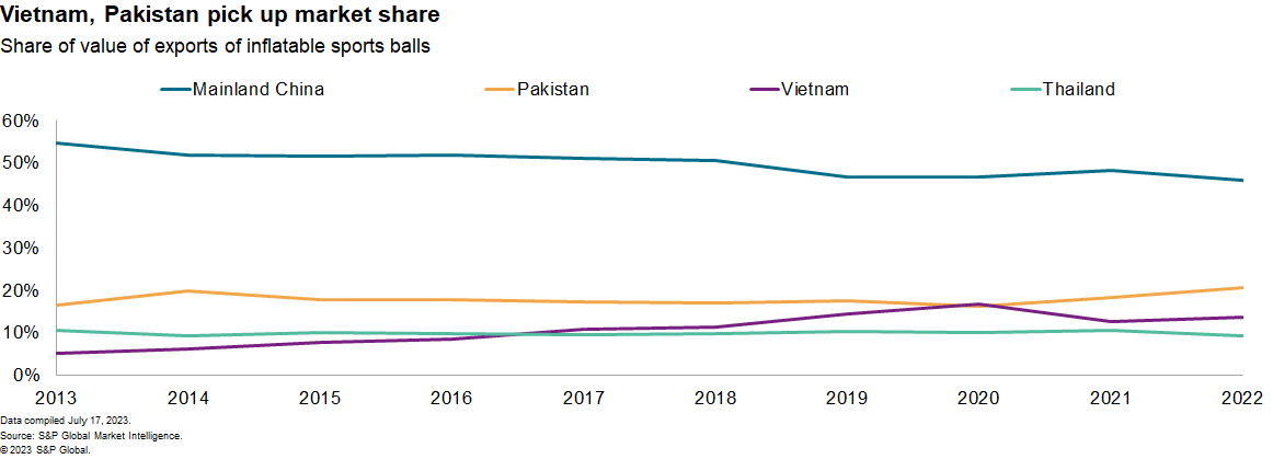 Based on importers' data, mainland China accounted for 46% of all inflatable ball shipments in 2022, compared with 55% in 2013. Much of that lost share shifted to Pakistan, which accounted for 21% of shipments in 2022, compared with 16% in 2013.