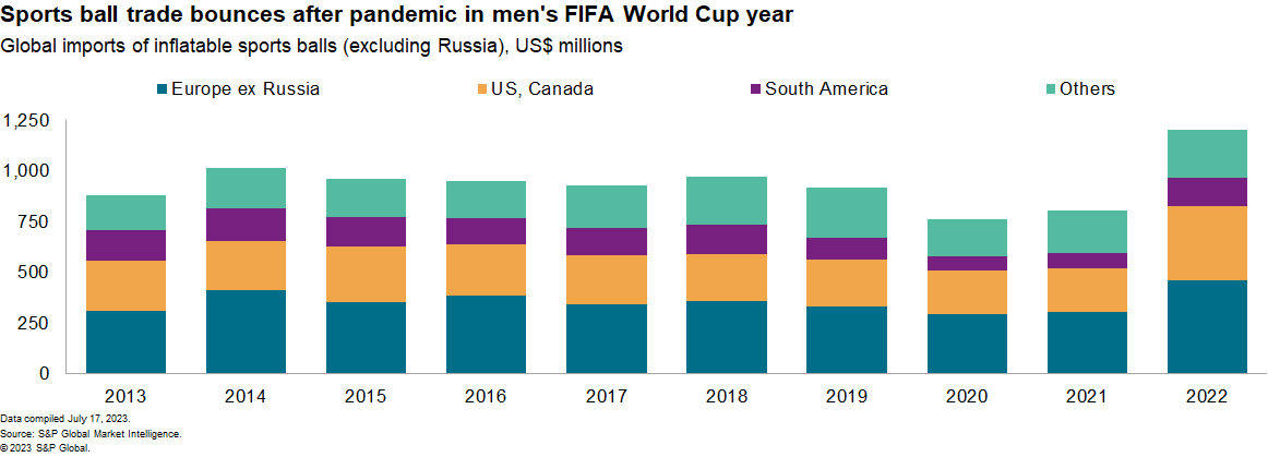Global trade in inflatable balls, including those used in other sports such as rugby, basketball and American football and incorporating both premium and basic brands, climbed by 50% year over year in 2022 to $1.20 billion.