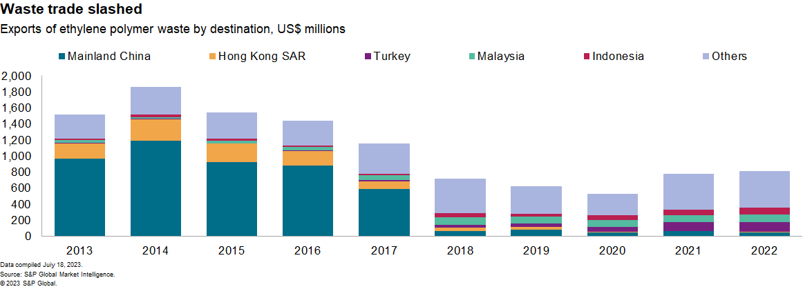 Global exports of waste from polymers of ethylene were valued at $813 million in 2022. That was down by 43% compared with 2016, due in part to a change in import policies for waste in mainland China.
