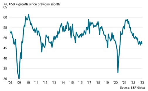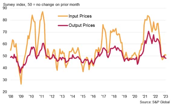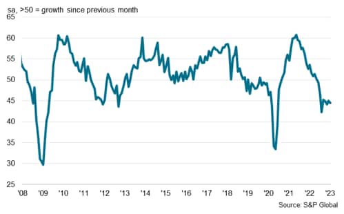 Firms signalled further substantial declines in both output and new business amid reports of weaker global demand conditions. Moreover, the downturn in new export orders quickened in January, with firms noting that high inventory levels at some clients and weak global economic conditions had weighed on sales. This led companies to cut back on their purchasing activity and inventories again at the start of 2023. When assessing the 12-month business outlook, manufacturers generally anticipate output to decline further.