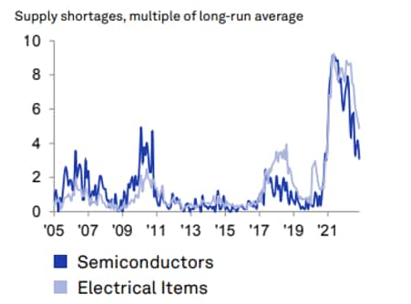 The slowdown in the global electronics industry has been a key factor impacting on Taiwan's industrial economy during the second half of 2022 and early 2023 due to its importance in overall industrial production and exports. Global industry supply shortages for the semiconductors and electrical product industries have moderated in recent months, but still remain above their long-run average, although these shortages have continued to ease in recent months.