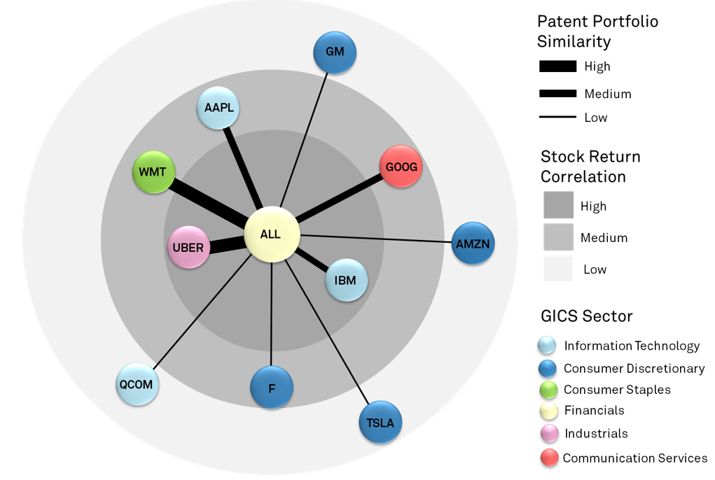 Companies strategically innovate and acquire intellectual property. That innovation is increasingly taking place outside of a firm’s traditional business focus and varies widely between companies in the same sector. Investors can group firms by their shared technology attributes using patent data. Because of the importance of intellectual property in a firm’s value, stock prices of companies with similar patent portfolios exhibit peer group momentum. For example, Allstate and Uber each hold more than 50 patents in autonomous driving technology and have highly correlated stock returns, despite the two having different sector assignments (Figure 1).