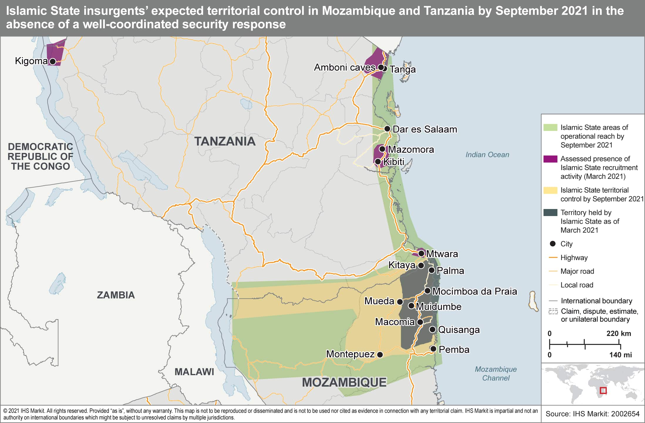 Attacks are also likely in Mtwara in Tanzania, targeting public spaces such as the market to inflict mass casualties, or against government assets and staff. However, the insurgents would probably not be able to capture and then hold Mtwara because Tanzanian security forces are more capable than Mozambican forces and have experience in fighting Islamic State-linked insurgents.