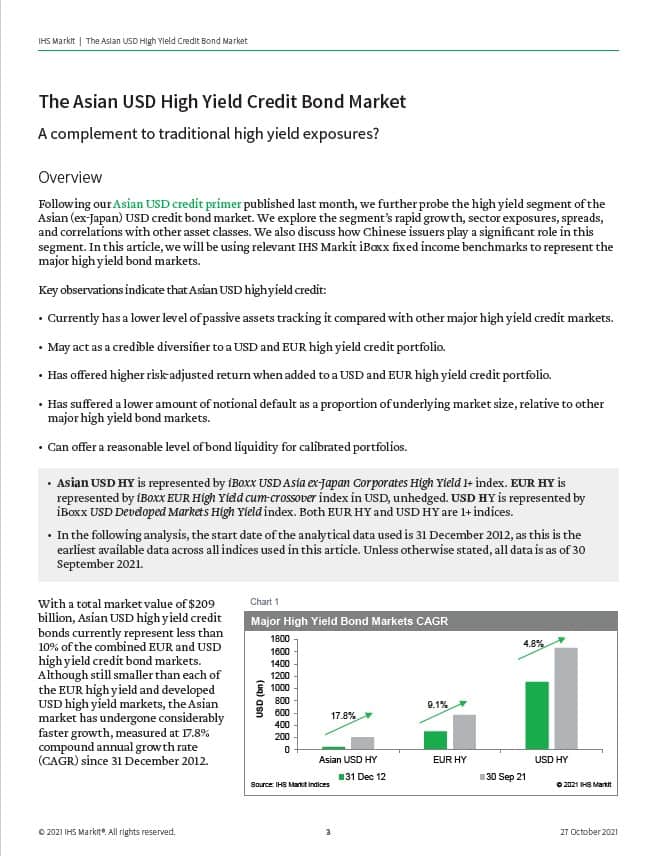 Following our Asian USD credit primer published last month, we further probe the high yield segment of the Asian (ex-Japan) USD credit bond market. We explore the segment's rapid growth, sector exposures, spreads, and correlations with other asset classes. We also discuss how Chinese issuers play a significant role in this segment. In this article, we will be using relevant IHS Markit iBoxx fixed income benchmarks to represent the major high yield bond markets.