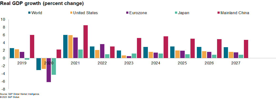 While Western Europe and North America will likely experience mild setbacks in early 2023, recession risks are diminishing, and annual real GDP growth will be positive in both regions. After its abrupt exit from zero-COVID policies, mainland China's rebound is coming sooner than anticipated, lending support to its trading partners. Market Intelligence analysts project world real GDP growth to pick up to 2.9% in 2024 and 3.0% in 2025, as inflation subsides and monetary policies ease.