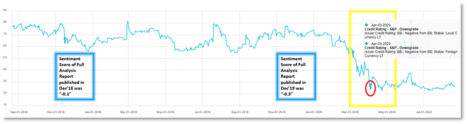 3M Downgraded To 'A+' On Continued End-Market Pressure, High Leverage; Outlook Negative in February 2020. Despite holding a higher credit rating with a stable outlook in January 2020, the sentiment score from research had been consistently negative since 2019, as illustrated in Figure 3.