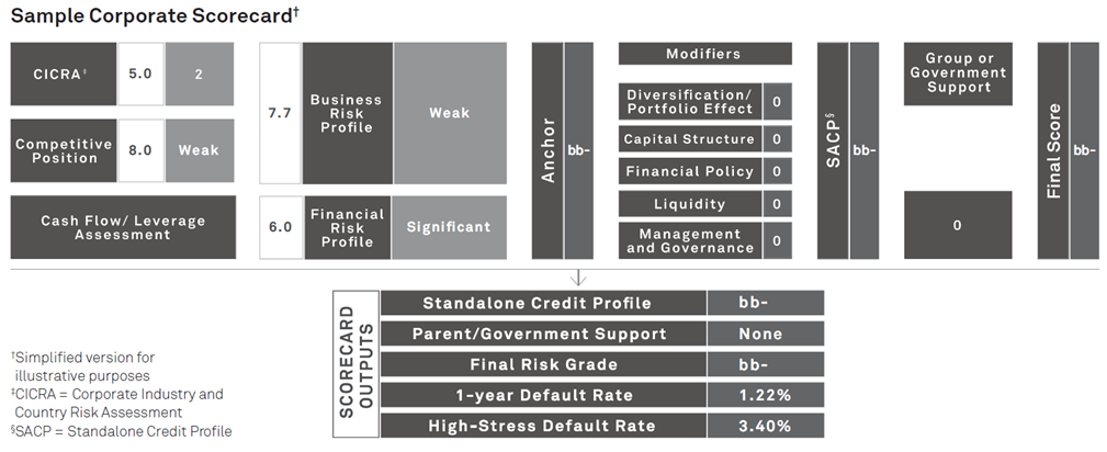 Scorecards provide a consistent framework for calculating credit risk, drawing on a mixture of quantitative and qualitative questions in a check-box style. They are fully transparent, providing underlying logic and weights, and generate numerical scores that are broadly aligned with S&P Global Ratings’ criteria.[3] Scorecards are especially useful for low-default portfolios that, by definition, lack the internal default data necessary for the construction of statistical models that can be robustly calibrated and validated.