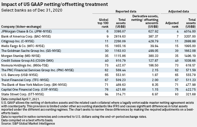 For the latest ranking, company assets were adjusted on a best-efforts basis for pending mergers, acquisitions and divestitures, as well as M&A deals that closed after the end of the reporting period through March 31. Assets reported by non-U.S. dollar filers were converted to dollars using period-end exchange rates. Total assets were taken on an "as-reported" basis and no adjustments are made to account for differing accounting standards. The majority of the banks were ranked by total assets as of Dec. 31, 2020. In the previous ranking published April 7, 2020, most company assets were as of Dec. 31, 2019, and were adjusted for pending and completed M&A as of March 31, 2020.
