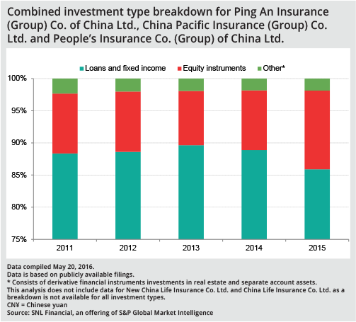 At Ping An, China Pacific Insurance and PICC, proportions of stock holdings in their total investment portfolios grew to a combined 12.20% at the end of 2015 from 9.30% three years earlier, according to SNL Financial data based on company disclosures.